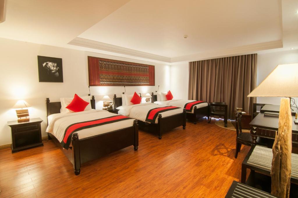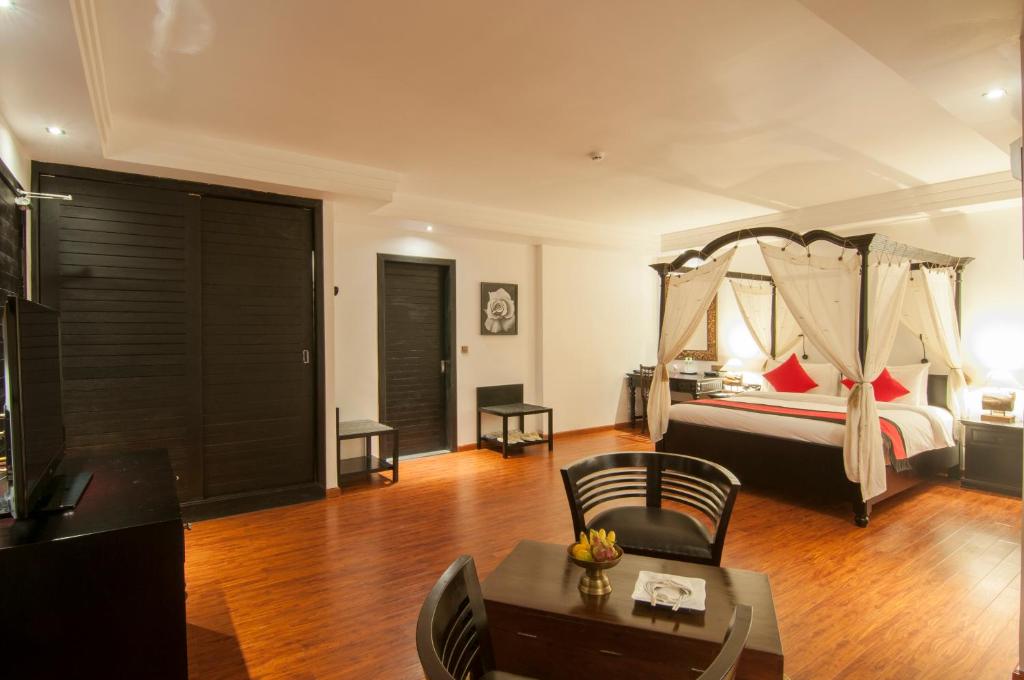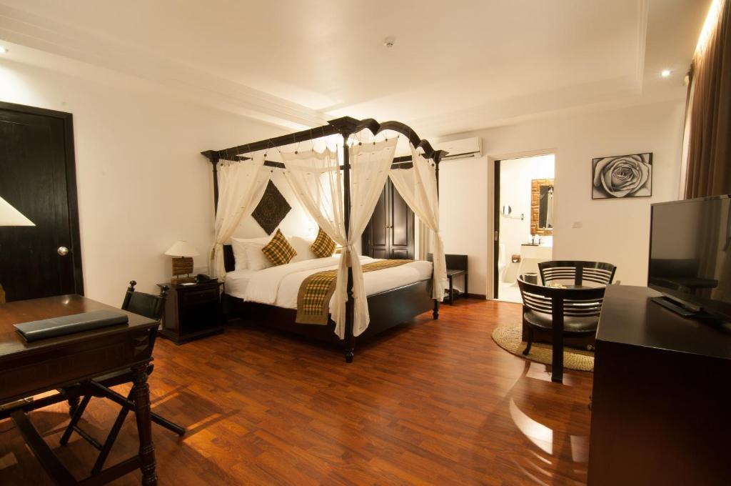 La Rose Suites in Phnom Penh offers spacious suites with four-poster beds. The property features an outdoor pool, restaurant, and a 24-hour front desk. Guests can enjoy free private parking and WiFi in all rooms. The suites are air-conditioned and equipped with modern amenities, including a flat-screen cable TV, DVD player, safe, electric kettle, and mini-bar. The hotel is conveniently located near major attractions, such as the Royal Palace, Tuol Sleng Genocide Museum, and Riverfront Park, with Phnom Penh International Airport just 5.6 mi away.