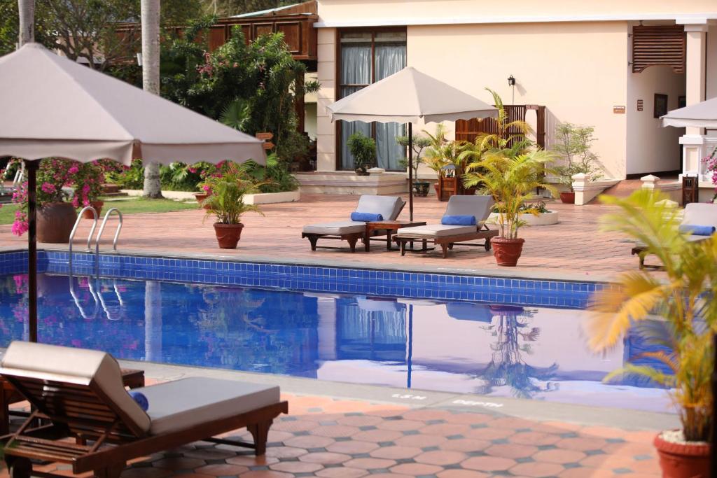 Victoria Can Tho Resort, situated on the serene banks of Can Tho River, offers 4-star comfort in a colonial-style architecture surrounded by exotic gardens. Guests can unwind by the outdoor pool with a drink.