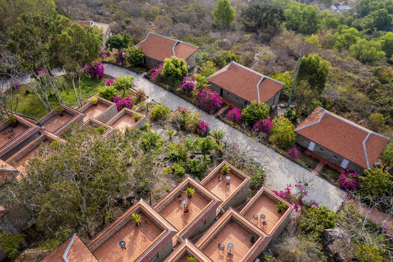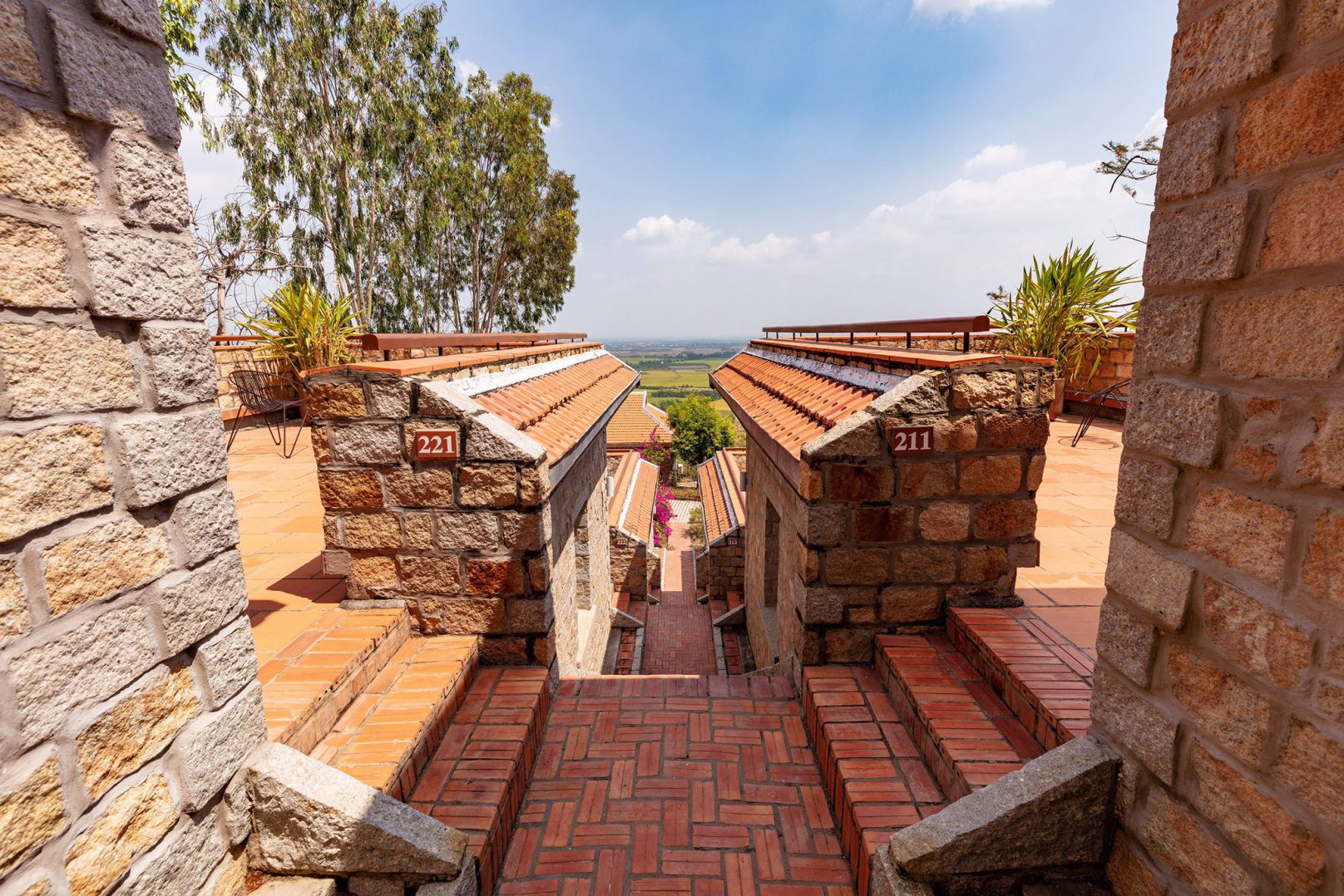 The rooms are thoughtfully designed with traditional wooden furnishings, canopy beds, and cool tiled floors, creating a comfortable and authentic ambiance. Each features a private open-air terrace, perfect for enjoying sweeping views of the countryside. Modern amenities include cable TV, a minibar, and tea and coffee-making facilities.