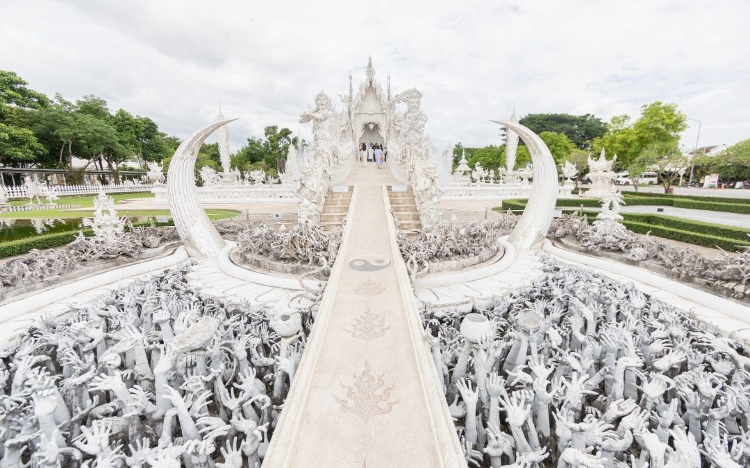 Next, head to the world-renowned White Temple (Wat Rong Khun), one of Thailand’s most iconic architectural wonders. Designed by Thai artist Chalermchai Kositpipat, this unique temple is a vision of intricate beauty, entirely white to symbolize purity and wisdom. The temple’s walls are adorned with elaborate sculptures and murals that blend Buddhist and contemporary themes. As you explore, you’ll find yourself captivated by the temple’s surreal details and symbolism. It’s not just a place of worship; it’s a true work of art that reflects Thailand’s rich spiritual and artistic heritage.